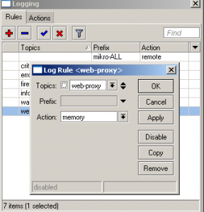 Öncelikle yeni bir Log kuralı yaratıyoruz. Topics mikrotik üzerindeki hangi olaylarda hangi uygulamalarla ilgili kayıt tutabileceğimize ilişkin bir seçenek sunar. Biz burada Web-Proxy uygulaması ile ilgili kayıt tutacağımızı ve kayıtların standart MEMORY kayıtlarında durmasını seçiyoruz.