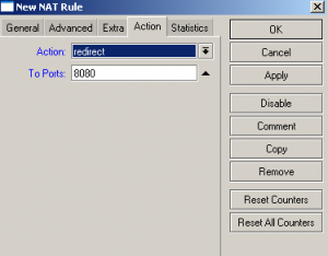 Aynı ekran üzerinde ACTION kısmında REDIRECT seçiyoruz, bu işlem gelen tüm paketleri Mikrotik Firewall üzerinde bir başka port’a redirect etmemizi sağlamaktadır. Bu sayede kullanıcılarımızda herhangi bir değişikliğe gerek olmaksızın ofisimizden gelecek tüm talepler az önce ayarlarını yaptığımız Proxy sistemimize yönlenecektir.