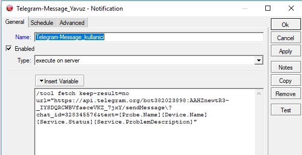 /tool fetch keep-result=no url="https://api.telegram.org/bot382023898:AAHZnewtR3-_IYSDQRCWBVfaeceVKZ_7jxY/sendMessage\?chat_id=CHAT_ID_NUMARANIZ&text=[Probe.Name][Device.Name][Service.Status][Service.ProblemDescription]"