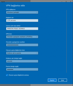 Bu bölümde ilk olarak Tür seçimi yapıyoruz. Vpn Türü olarak L2TP seçiyoruz ve gerekli yerleri dolduruyoruz.