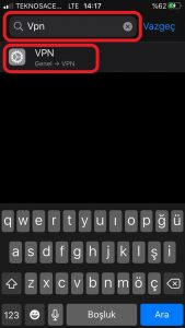 Öncelikle telefonumuzdan “Ayarlar” bölümüne giriyoruz. Arama bölümüne “VPN” yazıp giriş sağlıyoruz.