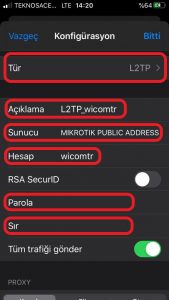 Sır : IPsec Secret ( L2TP Server bölümünde verdiğiniz ip sec şifresi )