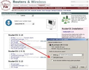 - İlk adım olarak http://www.mikrotik.com adresine girerek “download” bölümünden mevcut mikrotik yazılımınızın gerekli güncelleme paketi çekmeniz gerekmektedir. Mikrotik yazılımı bir server kurulu ise Intel/AMD PC menüsü altından gerekli yükseltme paketini çekebilirsiniz.