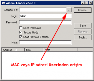 “Connect To” alanını görüyorsunuz. Buraya normal şartlarda IP adresi veya Mikrotik’in MAC-ID adresini yazarak erişmenize imkan tanır. Yani hem Layer3 hem Layer2 tabanını kullanarak yönetebilirsiniz.