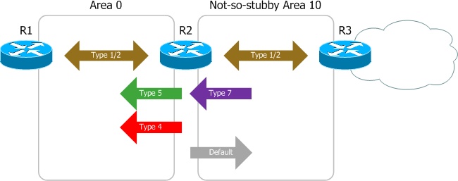 Tip 3 LSA’lar bölgeye girip çıkacaktır. Normal bir STUB Area aksine, ABR olacak değil açıkça bunu yapmak için yapılandırılmış sürece NSSA içine varsayılan bir yol tanımlanır. Trafik, varsayılan bir rota olmadan harici hedeflere yönlendirilemediğinden, muhtemelen bir tane ekleyerek eklemek istersiniz default-information-originate tanımlanmalı.
