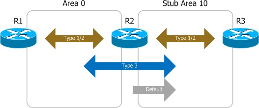Stub Area tip 1, 2 ve 3 LSA içerebilir. Harici rotalar yerine varsayılan bir rota kullanılır.