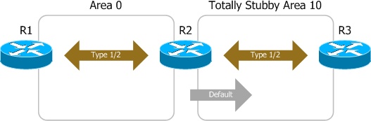 Total Stub Area sadece tip 1 ve 2 LSA ve tek tip 3 LSA içerebilir. 3 LSA tipi, tüm harici ve bölgeler arası yollar için ikame edilmiş bir varsayılan yolu tanımlar.
