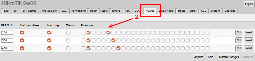 Ether2 Portumuz trunk olduğu için ilgili portların hepsinde member olarak işaretleniyor. diğer Ether 6-7-8 portları member oldukları VLAN lara Member (ilişkilediriliyor )