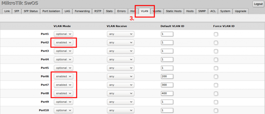 şimdi 2. resimdeki gibi “VLANs” menüsü içerisinde hangi vlan hangi port ile ilişkili olacak ise bunları tek tek belirliyoruz.